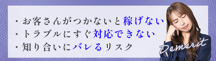 指名がもらえるとその分指名料が入るので、稼ぎやすくなります。一方で、お客さんからの人気があまりなくリピートがもらえないと、フリー客が多くなり、結果的にやや稼ぎにくくなります。ただしこれは、デリヘルのデメリットというよりは、風俗ジャンル全体の注意点ですので、どんなお店で働くにしろ、最低限の自分磨きは欠かさないようにしましょう。